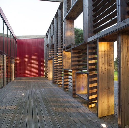 Bâtiment ossature bois, compact, à double peau brise-soleil, isolation renforcée