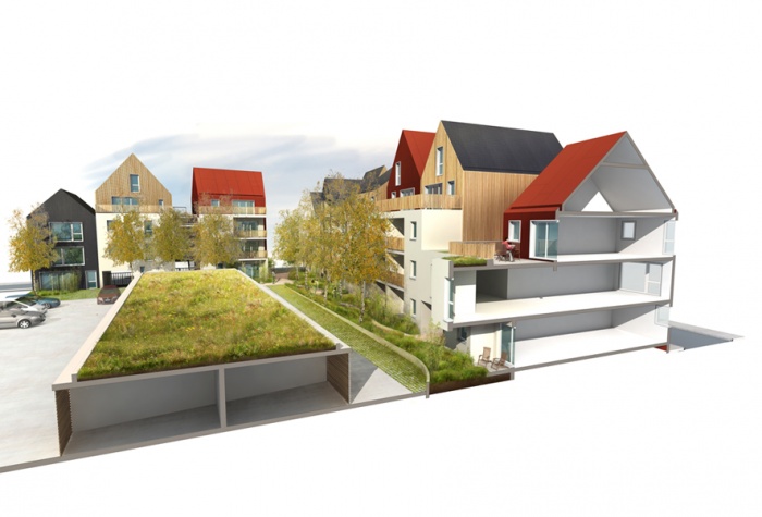 Il en résulte une typologie singulière qui mixe appartements et duplex et qui n’a pour seul objectif que de s’intégrer à l’environnement existant. Les matériaux en façade répondent également aux contraintes de durabilité et d’une maîtrise économique du projet, la juste proportion entre ces matériaux nous permettant de garantir les coûts et un équilibre harmonieux.