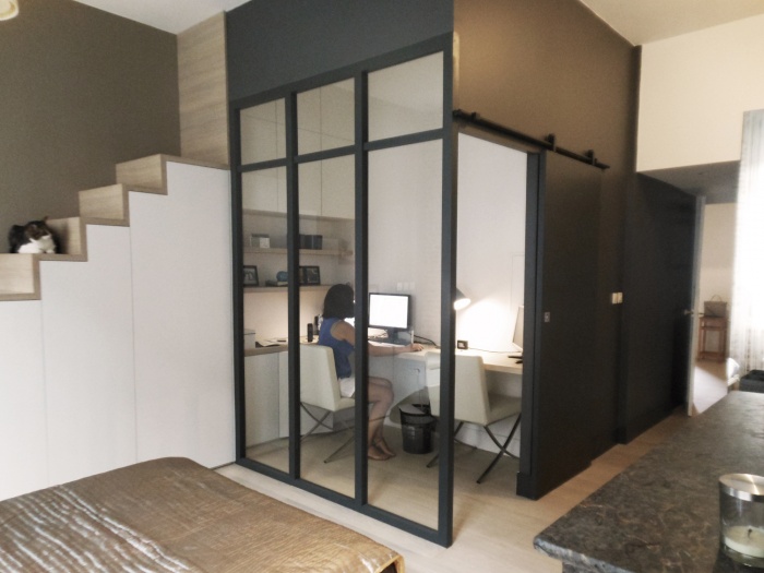 créer un bureau séparé dans la chambre dans un petit appartement et retrouver un espace pour la salle d'eau.+ réfection générale de l'appartement sol et peinture...