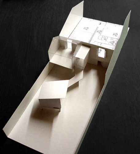 La difficulté du projet étant d’une part, de s’autoriser une véranda au volume généreux – pleinement ouverte au Sud sur un jardin très arboré – tout en respectant les contraintes de zone inondable cumulées à celles du PLU ; d’autre part, de conserver une communication à niveau de l’existant (RdC) tout en laissant les circulations possibles et accès aux caves en rez-de-jardin, le niveau de l’habitation existante étant à mi-hauteur.