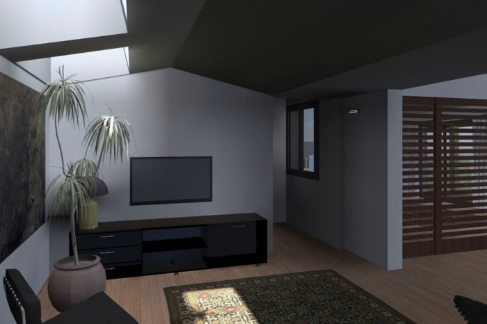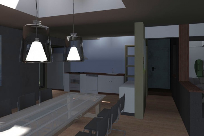 La maison se trouvant sur un terrain soumis à deux zones PPR (Plan de Prévention des Risques), la seule solution conforme aux règlements consiste à construire l'extension sur la terrasse existante. Cette dernière reçoit le nouveau séjour. La surface ainsi libérée permet de satisfaire aux exigences des éléments restants du programme : suite parentale, grande cuisine, coin télé, toutes les chambres indépendantes avec salle de bain, cellier, buanderie, atelier.