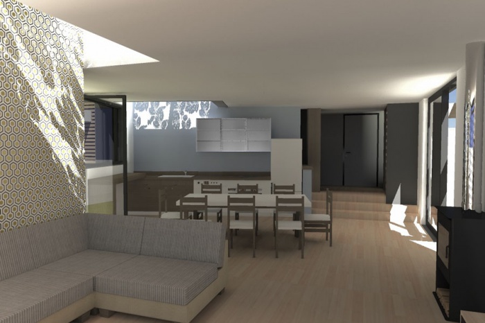 La terrasse vêtue d'une pergola, bordée par le mur séparatif, a pour fonction d'exposer le séjour au Sud et de profiter de sa qualité de lumière, tout en se préservant du voisin proche. Cette composition permet d'exploiter au mieux tout le potentiel du terrain et donne toute sa viabilité au projet.