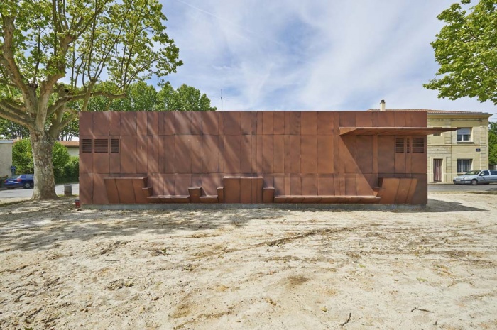 Bâtiment brut de forme simple dont la façade côté Place habillée de métal se plie pour servir de banc, de tablette ou de casquette.
