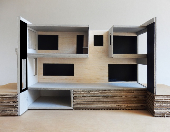 Deux façades menuisées, se faisant face, réalisées sur toute la hauteur et la profondeur de la construction rassemblent l'intégralité des fonctions. Les panneaux de contreplaqué de peupliers, constituant ces façades, dissimulent les rangements et équipements techniques nécessaires au fonctionnement de la maison. Des renfoncements ménagés dans ces façades, revêtues de panneaux de contreplaqués filmés noirs, sont conçus comme autant d'alcôves habitables . Un évidement central, tel un atrium, couvert d'une verrière fait pénétrer largement la lumière naturelle.