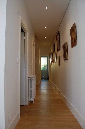 La maison a été complètement vidée sauf pour les planchers et le volume de l'escalier. Autour de l' escalier une nouvelle distribution, très ouverte en rez-de-chaussée et plus conforme a l'existant à l'étage, a été organisée. Les combles ont été récupérés pour en faire la suite parentale.