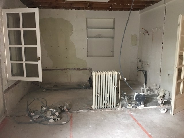 Avant toute chose la priorité a été de mettre à nu les murs et plafonds en déposant les toiles tendues qui cachaient comme nous le craignions de l'humidité.