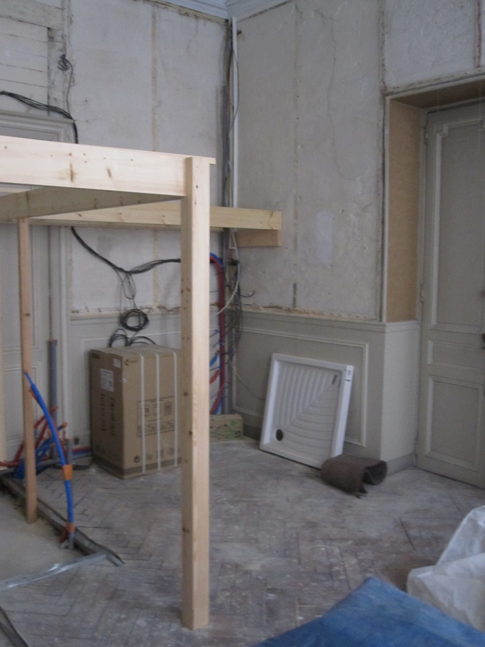 Décaissement du sol pour avoir 2 m sous plafond dans la salle de bains et 2 m sous plafond sur la mezzanine